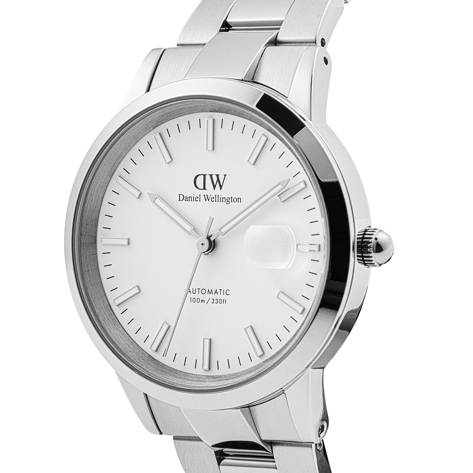 The Iconic Link Automatic is our most advanced timepiece to date, featuring a self-winding movement powered by the motion of your wrist. This version’s luminous white dial has an exclusive enamel finish, delivering a glossy and vivid appearance. It boasts glow-in-the-dark index markers and floating hands, a magnified date display, and water-resistance up to 100 meters. The quick release spring bars on the silver link strap make for easy style changes, and there is scratch-resistent sapphire crystal covering the front and back of the watch. The exhibition case back exposes the automatic movement inside. A watch designed to get you where you need to be.