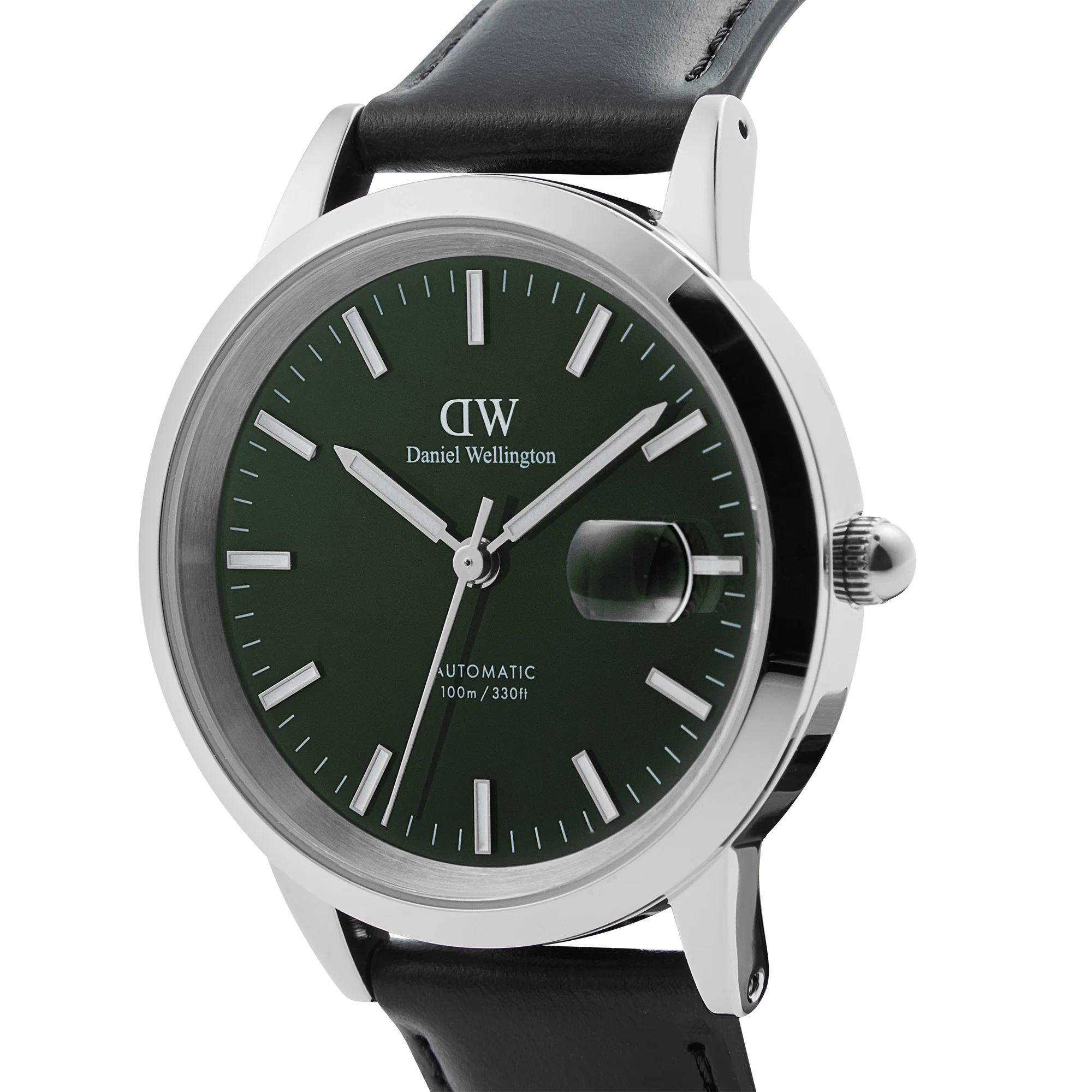 The Iconic Link Automatic is our most advanced timepiece to date, featuring a self-winding movement powered by the motion of your wrist. This version’s emerald green dial has an exclusive enamel finish, delivering a glossy and vivid hue. It boasts glow-in-the-dark index markers and floating hands, a magnified date display, and water-resistance up to 100 meters. The quick release spring bars on the black leather strap make for easy style changes, and there is scratch-resistent sapphire crystal covering the front and back of the silver watch. The exhibition case back exposes the automatic movement inside. A watch designed to get you where you need to be.